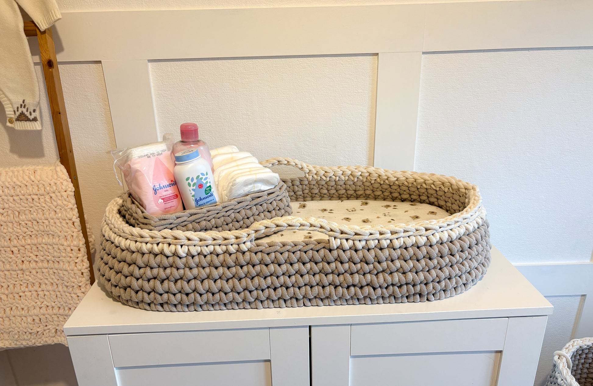 Beautifully coordinated to match your Moses basket, the changing pod completes the look and feel of your baby's space, thoughtfully made, heirloom quality and full of Love.